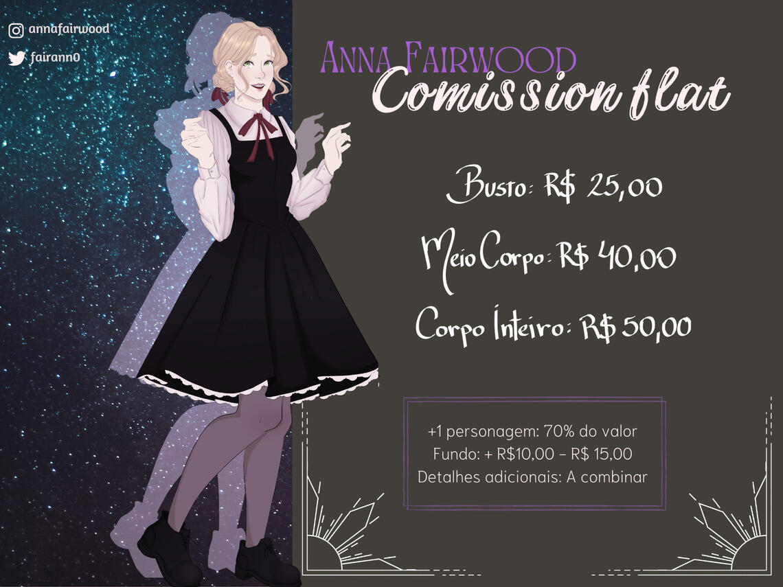 ➼ Pelo menos 50% do pagamento deve ser efetuado antecipadamente, o restante será cobrado após a aprovação do esboço. O cliente ainda pode pagar o preço integral antecipadamente.➼ Não haverá devolução do preço integral após o pagamento caso o cliente desista de seu pedido. O reembolso será realizado integralmente apenas se eu não puder concluir seu pedido, e somente 50% do preço será reembolsado caso o cliente desista depois de eu ter concluído e enviado o esboço.➼ Caso houver prazo para a entrega da comissão, é necessário que o cliente me avise no momento do pedido. Se o prazo for muito curto, eu tenho o direito de cobrar uma taxa a mais.➼ O tempo máximo para a conclusão é de 45 dias após o pagamento (ou parte dele) e a aprovação do esboço, no entanto pode haver variações conforme a minha saúde mental, meus imprevistos, compromissos e a complexidade do desenho. Eu sempre manterei o cliente atualizado.➼ Vale lembrar que eu não faço apenas uma comissão por vez e que eu tenho o direito de fazer artes pessoais. Não me cobre a não ser que eu passe uma semana sem te atualizar do progresso do desenho.➼ Eu tenho o direito de postar e usar a arte para portfólio, e sempre darei os créditos ao cliente, portanto, avise no caso não queira ser mencionado no post e no caso de não querer que eu poste o desenho, eu irei respeitar.➼ Não retire minha assinatura do desenho, não finja que foi você quem o fez. Isso é crime.➼ Mantenha os créditos da arte em qualquer rede social, e, se possível, me marque no post.➼ Negociações são sempre bem vindas, mas jamais insista em um não. Não seja um nice client.